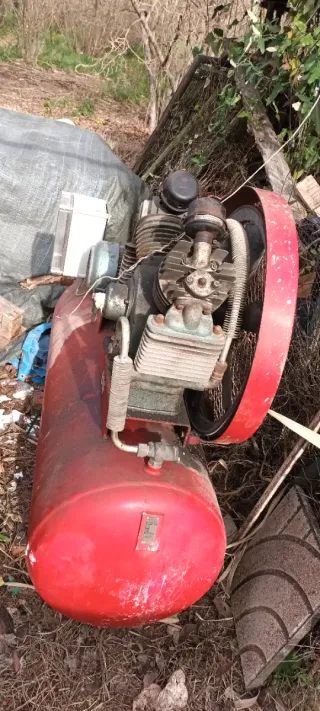 Compresor de aire de color rojo, con un manómetro visible. - Depósito vertical, no se la capacidad exacta pero diria que unos 1000 litros, - Conexiones de manguera en la parte superior e inferior. - Soporte metálico. El motor eléctrico funciona bien sin ruidos, pero el grupo de compresión hay que arreglarlo o cambiarlo. No se envía por volumen.