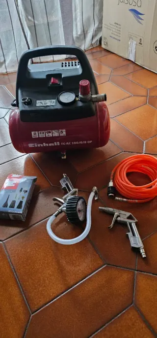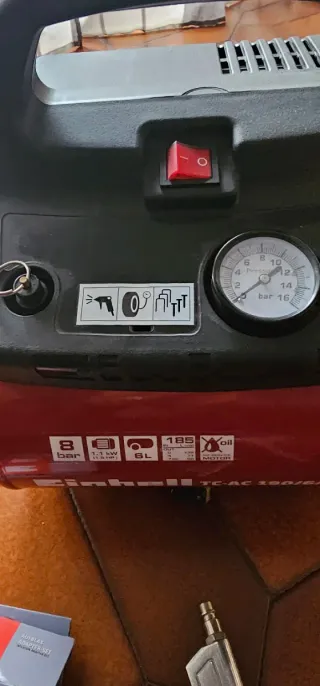 Compresor de aire Einhell con accesorios. - Modelo: TC-AC 190/8/6 OF. - Incluye manguera de aire naranja. - Pistola de aire con manómetro. - Caja de accesorios para compresor.NO NEGOCIABLE