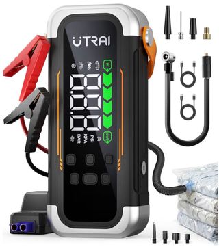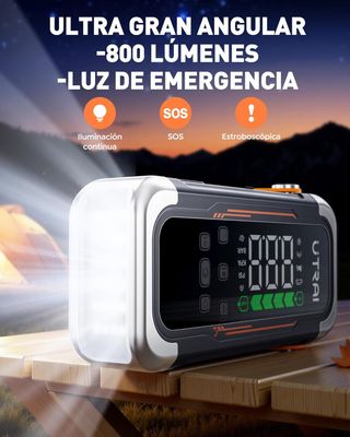 UTRAI. Arrancador de batería para coche 6000A con compresor de aire, soplador y power bank USB-C 30W PD. Linterna LED de emergencia, Booster portátil 12V para motores Gasolina y Diésel hasta 10L. - Pantalla digital. - Múltiples boquillas para inflar. - Cable de carga USB. - Pinzas de arranque rojas y negras. Nuevo, no tengo factura, no regateo.