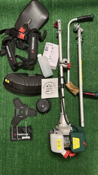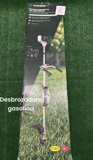 Desbrozadora de gasolina Parkside, modelo 471871. - Bobina de hilo doble con sistema automático de contacto para cortar bordes. - Cuchilla de 3 dientes para cortar matorrales. - Diámetro de corte de la desbrozadora: aprox. 25,5 cm. - Diámetro de corte del cortabordes: aprox. 43 cm. - Motor de 2 tiempos refrigerado por aire. - Potencia máxima: 1,35 kW (1,8 CV). - Cilindrada: 42,7 cm. Nueva a estrenar tags: Lial, Bosch, Maquita, Dewalt, Stayer, Inverter, Hilti, Worx, Metabo, Einhell, carpintero, carpintería, batería, pintór, pintura, reforma, obra, metal, percusión, radial, amoladora, sierra caladora circular laser, compresor,