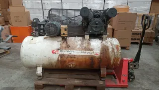 Compresor de aire de la marca Puska con dos cilindros. - Motor eléctrico. - Depósito de aire. - Polea y correa de transmisión. Está en Barakaldo -Vizcaya