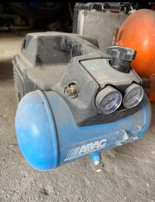 Compresor de aire portátil de la marca ABAC. - Color azul y negro. - Manómetro visible. - Interruptor de encendido/apagado.