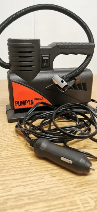 Compresor de aire portátil de tamaño reducido, con muy poco uso. - Depósito de aire de color naranja. - Carcasa superior negra con rejillas de ventilación. - Incluye manómetro y manguera.