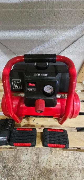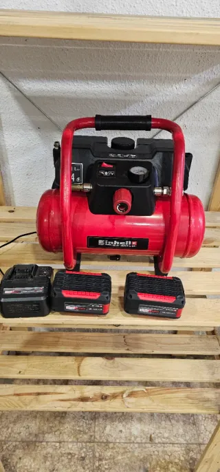 Compresor de aire Einhell de color rojo y negro, con asa para facilitar su transporte. - Indicador de presión. - Interruptor de encendido/apagado. Con baterías de 5.2 amperios para mayor autonomía incluye el compresor y las 2 baterías de 5 amp y el cargador se vende por falta de uso se a usado muy poco y las baterías son mayor de las que pone en la imagen conel precio