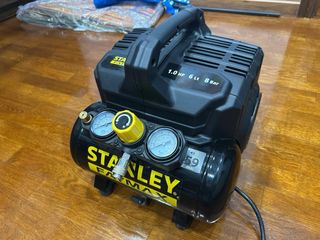Compresor de aire Stanley con depósito de 5 litros y potencia de 1.5 HP. Usado en dos ocasiones. - Presión máxima de 10 Bar. - Diseño compacto y portátil. - Incluye manómetros para control de presión. - Cuerpo principal en color negro y depósito amarillo.