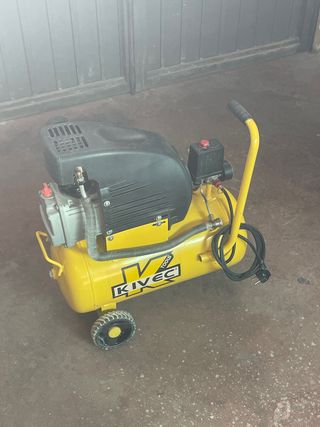 Compresor de aire KIVEC de 24 litros. Ideal para diversas tareas. - Capacidad del tanque: 24 litros. - Diseño portátil con ruedas. - Incluye asa para facilitar el transporte.
