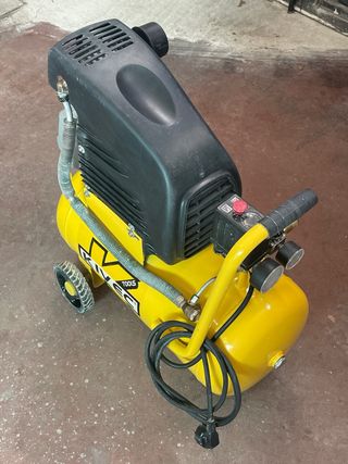 Compresor de aire Nuair con depósito de 24 litros. Recién revisado, aceite, filtro y ruedas nuevas, lleva regulador de presión y filtro de agua para poder pintar con pistola. Cilindro de fundición, nada que ver con los compresores baratos. - Depósito de 24L. - Diseño compacto y portátil. - Ruedas para facilitar el transporte.