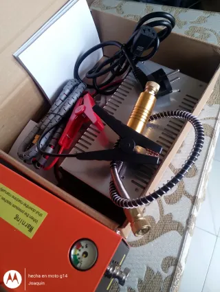Se vende compresor de aire con manómetros y soldador. Con accesorios - Diseño compacto y portátil. - Asa de transporte con agarre amarillo.