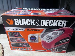 Compresor de aire portátil de la marca Black+Decker. Adecuado para: Coche. Fuente de energía: Corriente alterna, Voltaje de operación: 12 V, Voltaje de entrada AC: 220 - 230 V - Diseño compacto y ligero. - Incluye manómetro para control de presión. - Manguera de aire con boquilla. - Carcasa de plástico resistente en color naranja y negro.