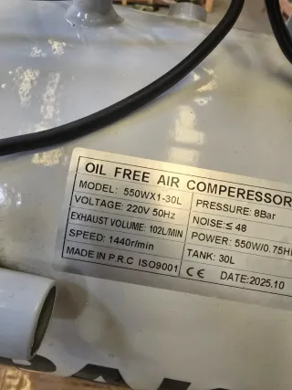 Compresor de aire comprimido. - Tanque de 30L. - Diseño compacto y portátil con ruedas. - Incluye manómetro y regulador de presión. SILENCIOSO Y SIN ACEITE Certificado CE IVA Incluido