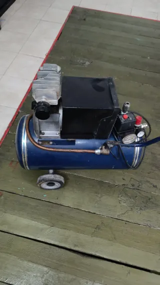Compresor de aire portátil de color azul. - Tanque de aire. - Motor con ventilador. - Ruedas para facilitar el transporte. No tiene tapa funciona bien sin pistola y sin tapa