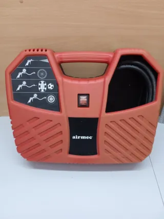 Compresor de aire portátil de la marca Airmec en color naranja. Incluye instrucciones gráficas para inflar diferentes objetos. - Diseño compacto con asa. - Interruptor de encendido/apagado. - Compartimento para manguera.