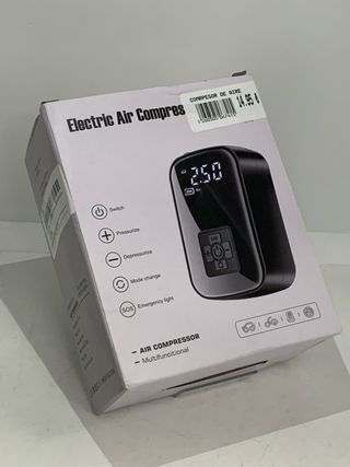Compresor de aire eléctrico portátil con pantalla digital. - Funciones: Switch, Presurizar, Depressurizar, Modo cambio, Luz de emergencia SOS. - Indicador de presión en bar. - Apto para coche, moto y bicicleta. Ref:: 1260305067415