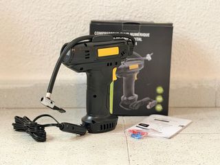 Compresor de aire portátil con pantalla digital. - Diseño ergonómico en color negro y amarillo. - Incluye manguera y cable de alimentación. - Viene con manual de instrucciones y adaptadores.