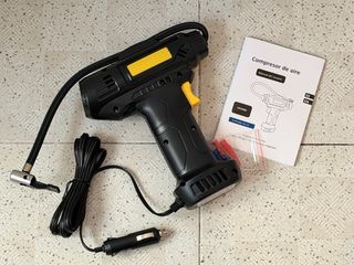 Compresor de aire portátil de la marca Goodyear. Ideal para inflar diversos artículos, la caja está deteriorada pero por estar en el coche parado - Luz LED para uso nocturno. - Lectura fácil del manómetro. - Incluye gama de adaptadores para pelotas, juguetes y otros artículos inflables. - Diseño compacto y fácil de transportar. - Fabricado en China.