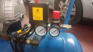 Compresor de aire Airum, diseñado para ser silencioso. Su tanque es de color azul brillante y cuenta con un asa para facilitar su transporte. - Doble cabezal de compresión. - Manómetro para control de presión. - Válvula de seguridad. regalo sprays y dispongo de un aerógrafo a la venta también con su pintura especializada.