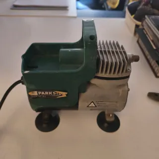 Compresor de aire de la marca Parkside (LIDL), modelo K 60 A1, diseñado para aerografía. Cuenta con un asa para facilitar su transporte. - Diseño compacto y robusto. - Base con patas de goma para mayor estabilidad. - Conexión para manguera de aerógrafo.