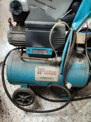 Compresor de aire Pintuc con depósito. - Color azul. - Ruedas para fácil transporte. - Etiqueta con la marca Pintuc y Compresores. Funciona perfectamente.