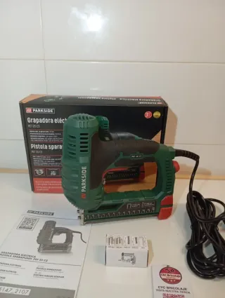 Grapadora eléctrica Parkside PET 25 C3. - Incluye manual de instrucciones. - Caja original. - 500 grapas y 500 clavos. tags: Lidl, Bosch, Maquita, Dewalt, Stayer, Inverter, Hilti, Worx, Metabo, Einhell, carpintero, carpintería, batería, pintór, pintura, reforma, obra, metal, percusión, radial, amoladora, sierra caladora circular laser, compresor, llave, atornillador, atornilladora, soldar, soldadura, aparato, pistola, grapadora, lijadora herramienta compresor, ingletadora, impacto, fresadora, broca, aspiradora, taladro martillo,bricolaje,manualidades,lienzos