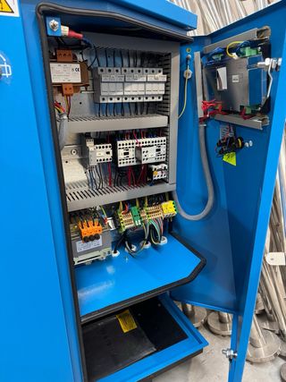Compresor de aire de tornillo con panel de control. - Incluye diagrama de funcionamiento. - Botón de emergencia. - Seccionador de bloqueo de puerta.