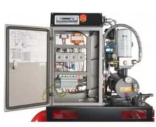 Compresor de aire de tornillo con panel de control. - Incluye diagrama de funcionamiento. - Botón de emergencia. - Seccionador de bloqueo de puerta.