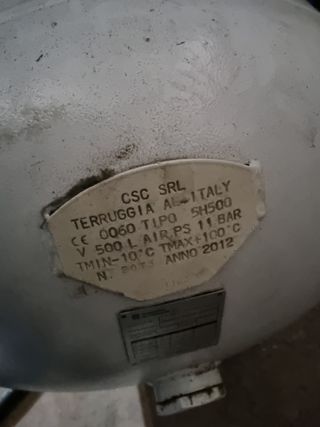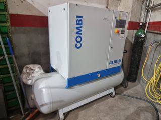 Compresor de tornillo con depósito de 500L, secador frigorífico y filtros de aire comprimido. Caudal de esta 11 bares. Revisiones al día. Se entrega con toda la documentación