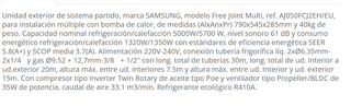 Unidad exterior de sistema partido Samsung Free Joint Multi - Modelo: AJ050FCJ2EH/EU - Capacidad nominal refrigeración/calefacción: 5000W/5700 W - Nivel sonoro: 61 dB - Consumo energético refrigeración/calefacción: 1320W/1350W - Eficiencia energética: SEER 5.8(A+), SCOP media 3.7(A) - Alimentación: 220V-240V - Conexión tubería frigorífica líq.: 2xØ6.35mm-2x1/4 - Conexión tubería gas: Ø9.52 + 12,7mm-3/8 + 1/2 - Longitud total de tuberías: 30m - Altura máx. entre unidades interiores: 7.5m - Altura máx. entre unidad interior y unidad exterior: 15m - Compresor: Inverter Twin Rotary - Ventilador: Propeller/BLDC de 35W - Caudal de aire: