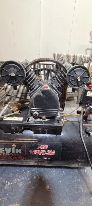 Compresor de aire marca Cevik, modelo 100VC-3M, color negro. 3 caballos de fuerza, 100l, 230V Bajo nivel de ruido gracias a los cilindros de hierro fundido, cabezal en V Incluye asas y ruedas para fácil transporte Flujo de aire: 336l/min El producto funciona correctamente, estéticamente simplemente suciedad Ideal para inflar, limpiar, tareas industriales, compresor, herramientas, maquinaria, portatil, garaje, trastienda, taller, nave, bricolaje, manitas Se aceptan ofertas