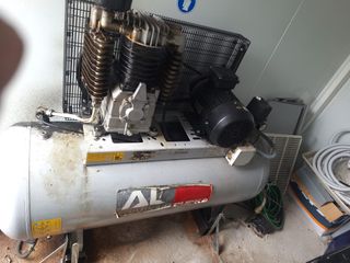 Compresor de aire de la marca AL PUSKA, ideal para talleres o uso profesional. - Tanque de gran capacidad. - Motor eléctrico. - Montado sobre palets para fácil transporte.