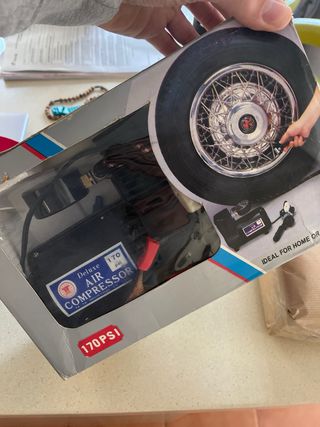 Compresor de aire de color azul, con una manguera roja y otra naranja. - Ruedas para facilitar el transporte. 24 L de tanque. Esta nuevo solo tiene dos usos, lo que tiene polvo de estar en el taller.precio negociable