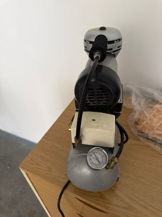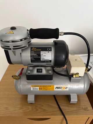 Mini compresor de aerografía Preciso. - Modelo: CP-203 - Voltaje: 220V/50Hz - Potencia: 120W - Presión máxima: 0.414 MPa - Tiempo máximo de operación: 2-3H - RPM: 2800 - Número de serie: 20065893