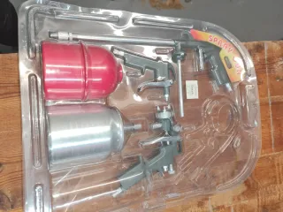 Kit de pistola pulverizadora para pintar. Tres pistolas diferentes para pintar, barnizar, limpiar con sus respectivas dos botellas y tubo para conectarla con sus racors al compresor y a las pistolas, nuevas sin utilizar en su embalaje original aunque esta avierto - Modelo Spray Gun. - Incluye accesorios. - Fabricado en Italia. TAMBIEN ACEPTARIA CAMBIO POR BATERIAS PARA PARKSIDE NUEVAS