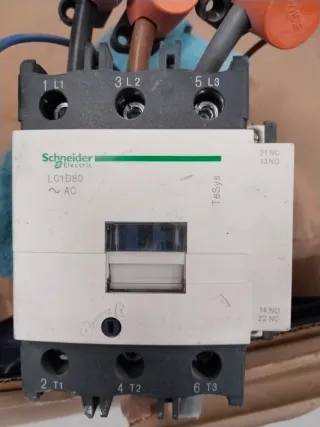Contactor Schneider LC1D80 para AC. - Modelo: LC1D80 - Marca: Schneider Electric - Tipo: Contactor - Voltaje: AC Schneider Electric TeSys LC1D80 (AC). Se usa para conectar y desconectar cargas de alta potencia, normalmente motores trifásicos, resistencias, bombas, compresores, etc., desde un circuito de control. Los bornes L1–L2–L3 son la entrada de potencia y T1–T2–T3 la salida hacia la carga. ⚙️ Datos clave (aprox.): Marca: Schneider Electric Modelo: LC1D80 Corriente nominal: 80 A