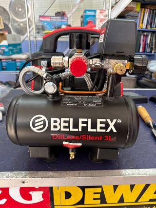 Compresor de aire Belflex con depósito de 3 litros. - Modelo OilLess/Silent. - Presión máxima: 8 Bar. - Caudal de aire: 110 L/min. - Potencia: 1 HP. - Voltaje: 230V. - Depósito: 3L.