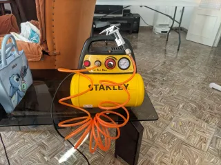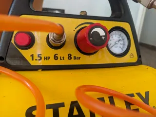 Compresor de aire Stanley con depósito de 6 litros y capacidad de 8 bares. - Motor de 1.5 HP. - Incluye manguera y pistola y inflador de ruedas - Sin aceite - Buena portabilidad La pistola pierde un poco de aire al comrparla en un paquete economico de manguera + pistola + inflador. Como su único uso ha sido limpiar el polvo de los ordenadores pues nunca me importó. El compresor funciona perfectamente.