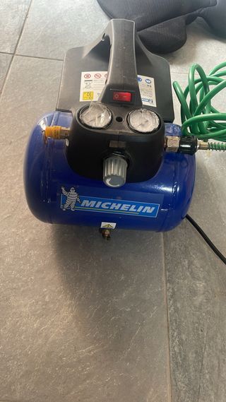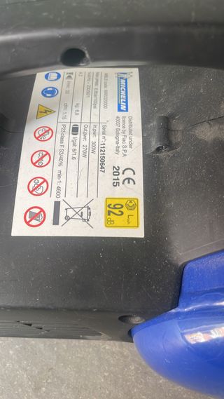 Compresor de aire de la marca Michelin. - Modelo: 9995320000 - Potencia de salida: 270W - Presión máxima: 6.8 bar / 100 psi - Voltaje: 230V / 50Hz - Peso: 6.8 kg - Año de fabricación: 2015 - Nivel de ruido: 92 dB