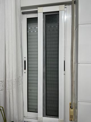 Puerta de baño con ventana translúcida y persiana enrollable. - Marco blanco de aluminio. - Tirador blanco. - Bisagras visibles.