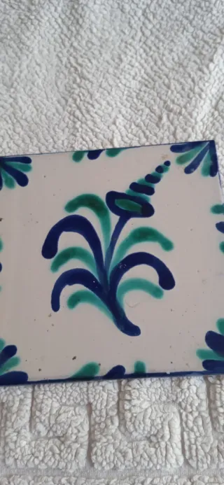 Pieza de cerámica artesanal con diseño de pájaro y flor - Borde decorado con motivos florales en azul y verde. - Acabado esmaltado. - 5 euros cada baldosa - Dispongo de 11 piezas - Medidas. 11cmx11cm