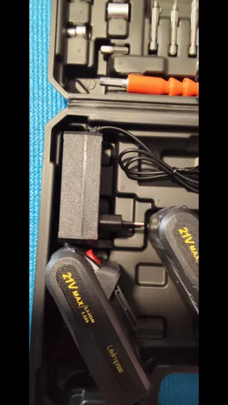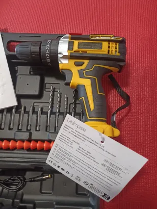 Taladro atornillador percutor a batería de 21V, ideal para trabajos en el hogar o profesionales. Incluye maletín y accesorios. - Dos Baterías de litio de 21V. - Incluye cargador. - Juego de puntas ,bocas y brocas. - Maletín de transporte. - Alargador flexible para sitios dificiles. - Compacto y ligero. - Ideal para trabajos de bricolaje y profesionales.
