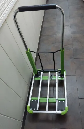 Carretilla plegable de color verde y estructura metálica. - Capacidad de carga: 150 Kg. - Mango acolchado. - Base de carga. - Ruedas para facilitar el transporte.