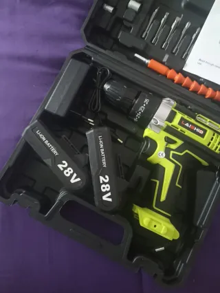 Taladro percutor a batería de 28V, ideal para trabajos de bricolaje y construcción. Incluye maletín y accesorios. - Dos baterías de 28V incluidas. - Cargador de batería. - Juego de brocas,bocas y puntas. - Extensión flexible para taladro. - Maletín rígido de transporte. - Compacto y potente. - Diseño ergonómico. - Regala artículos útiles.