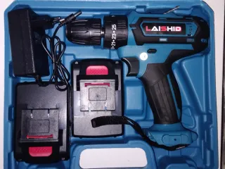 Taladro inalámbrico de la marca LAISHID, ideal para tus proyectos. - Incluye taladro, dos baterías y cargador. - Diseño ergonómico en color azul y negro. - Mandril de 10mm. Taladro Percutor a Bateria 21V, Taladro Atornillador Bateria con 2 Baterías 2000mAh, 32Nm, 25+3 Ajuste de Par Destornillador Electrico, 24 Accesorios, 2 Velocidad, LED Luz Para Hogar, Bricolaje