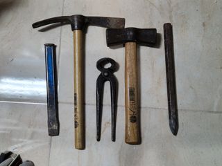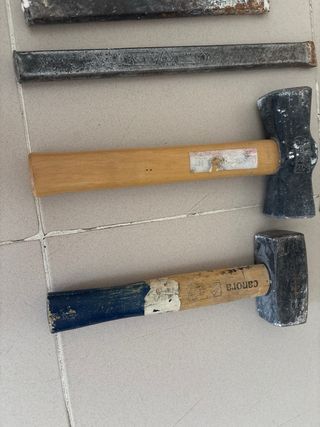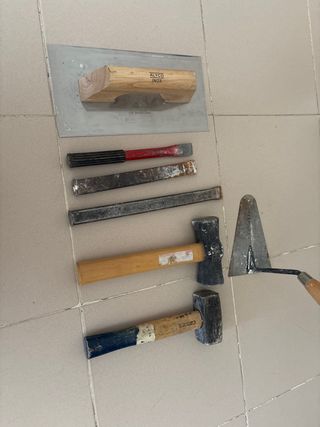 Juego de herramientas usadas para albañilería. Ideales para pequeños trabajos de bricolaje o reparaciones. - Incluye una llana de acero inoxidable, dos mazos, cinceles y una paleta de albañil. - Las herramientas muestran señales de uso, pero están en buen estado general. cortafrios bellota