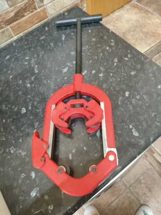Se venden herramientas variadas, ideales para trabajos de fontanería o bricolaje. - Cortatubos de metal rojo con rueda de corte. - Alicates de fontanero de color rojo y negro.