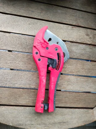 Herramienta para cortar tubos de PVC y PPR. Cuenta con una apertura amplia y un filo de corte afilado para un corte limpio. - Diseño ergonómico para un agarre cómodo. - Mecanismo de trinquete para facilitar el corte.