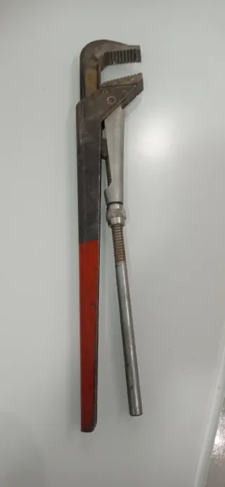 Llave de fontanero para tubos, también conocida como llave grifa. Es una herramienta robusta y duradera. - Mandíbulas dentadas para un agarre firme. - Mango con recubrimiento rojo para mayor visibilidad y agarre.