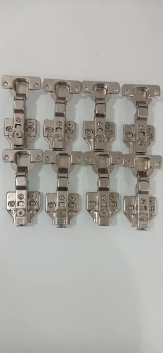 Lote de 8 bisagras hidráulicas de cazoleta marca amig, ideales para muebles. -Bisagras semiacodadas - Fabricadas en metal plateado. - Diseño de cazoleta para montaje empotrado. - Mecanismo de cierre suave y silencioso.
