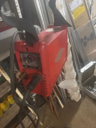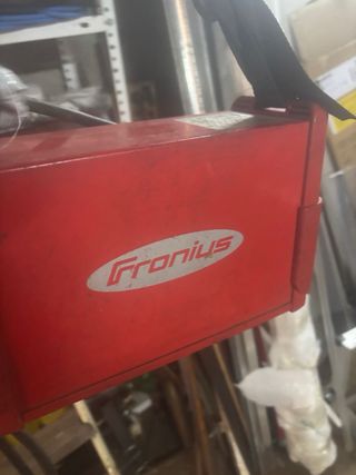 Soldador de la marca Fronius, modelo Transpocket 1500. - Color rojo. - Diseño compacto y portátil.