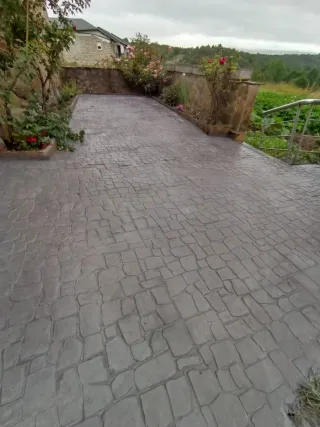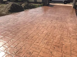 Pavimento de hormigón impreso y pulido con acabado de alta calidad. Ideal para exteriores. - Diseño imitación piedra. - Color rojizo. - Superficie lisa y brillante.