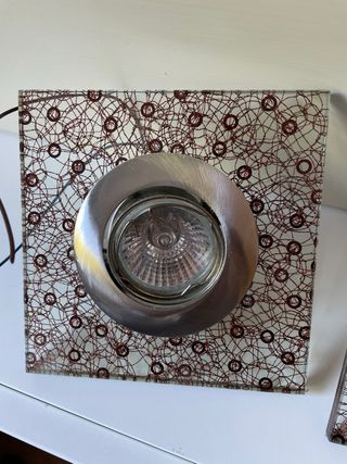 Dos apliques decorativos con base de cristal y detalles en aluminio. - Diseño moderno con estampado. - Acabado en aluminio cepillado. 20€ cada uno